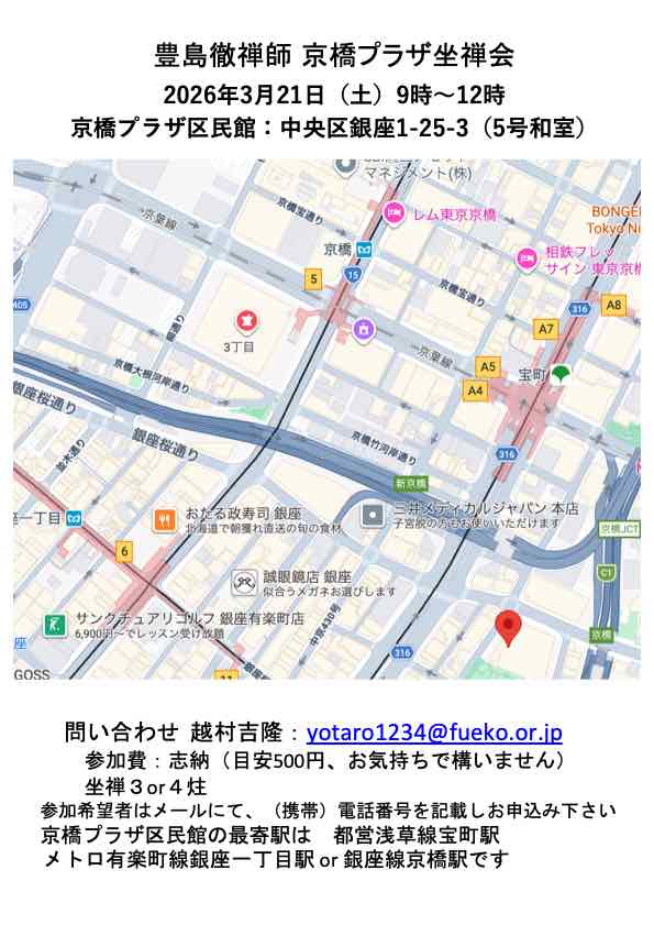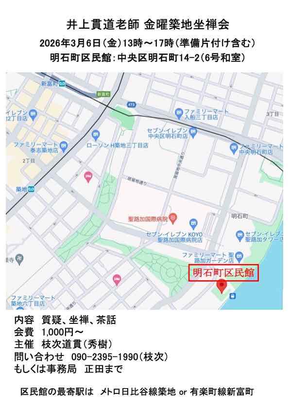 曹洞宗僧侶 井上貫道老師・豊島徹禅師をお招きして、毎月東京都内で坐禅会を開催しています。
